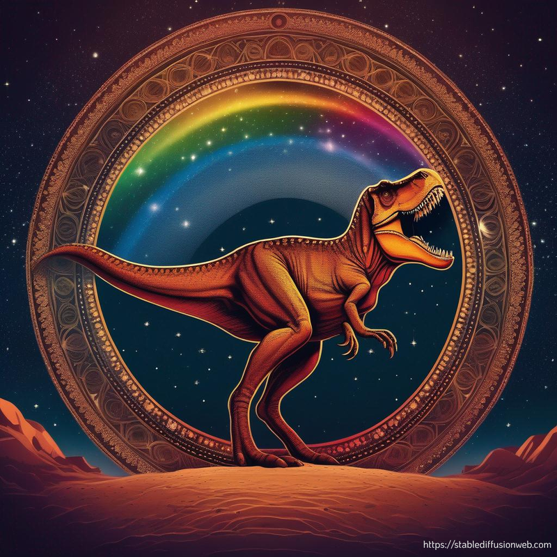 Oh yeah? What about... "a mesmerizingly vibrant and colossal T-Rex with an iridescent, shimmering skin that reflects all the colors of the spectrum. It stands in a fantastical, alien landscape filled with towering, luminescent mushroom-like structures and a flowing river of brilliant, neon light. In the background, an otherworldly nebula explodes with the most intense and vivid colors across the cosmic star-filled sky"!? [1]