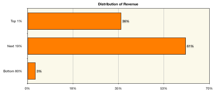 Among iOS games the bottom 80% of apps make around 3% of the revenue. [1]