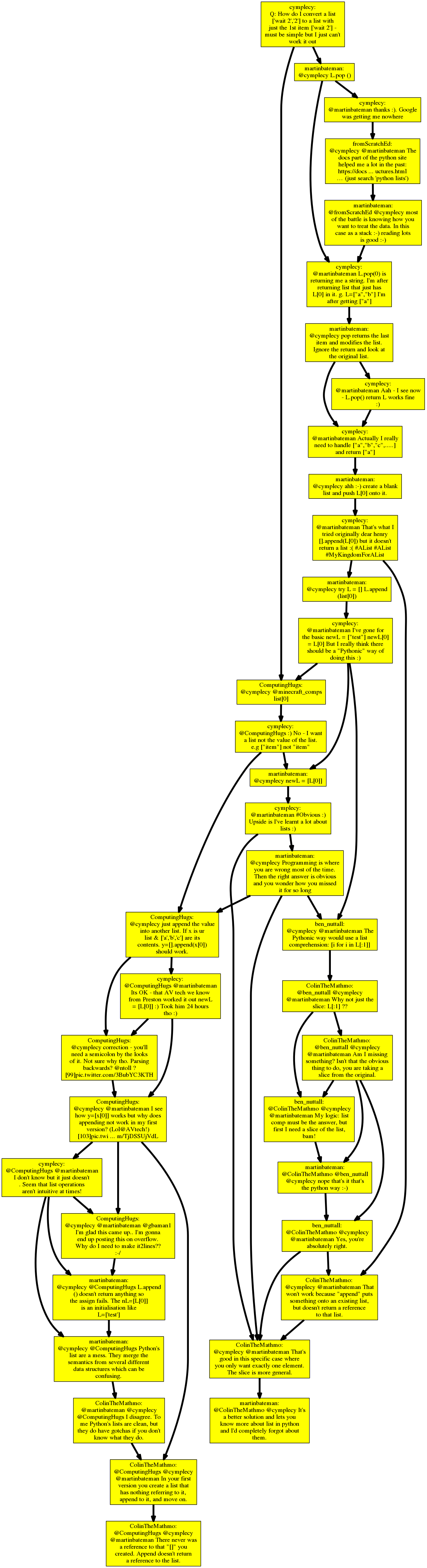Have you created a web service or app around it? Or is it on Github? A visual conversion graph would indeed help, the Twitter UX isn't really useable to follow up any longer conversation. I assume the Twitter UX has been even slightly degraded a bit over time for A) scalability reasons B) so that users stay longer on Twitter (good for advertisement statistics)